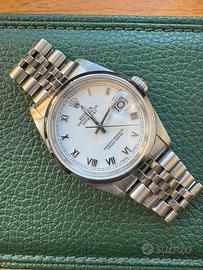 Vendo Rolex Datejust ref. 16200, anno 1989, in condizioni generali molto buone e completamente originale. PREZZO LEGGERMENTE TRATTABILE NO SOGNATORI ✔ Cassa 36mm in acciaio ✔ Ghiera liscia originale Rolex ✔ Quadrante bianco con numeri romani, white roman dial ✔ Bracciale Jubilee originale Rolex, codice clasp coevo all’orologio ✔ Vetro zaffiro ✔ Movimento Calibro Rolex 3135 L’orologio è accompagnato da: •Scatola Rolex originale •Garanzia di negozio del 2022, che certifica autenticità e controllo dell’orologio Orologio perfettamente funzionante, tiene bene il tempo. Mai lucidato pesantemente, anse e spigoli in ottimo stato. Stretch del bracciale nella norma per l’epoca. È un pezzo completamente coerente e originale in ogni sua parte, pronto per essere indossato o collezionato. Disponibile per ogni verifica da vostro orologiaio/negoziante di fiducia. Per ulteriori informazioni non esitare a contattarmi.