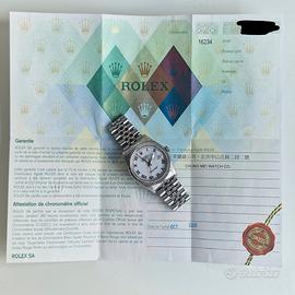 -Rolex Datejust -Ref 16234 -Diametro 36mm -Anno 2005 -Cassa acciaio no fori -Bracciale Jubilee acciaio teso -Quadrante bianco con indici romani -Vetro zaffiro -Corredo full set scatola e garanzia originale Rolex -Condizioni ottime -Revisione e prova di impermeabilità 7bar dicembre 2025 -Scrivete per qualsiasi informazione