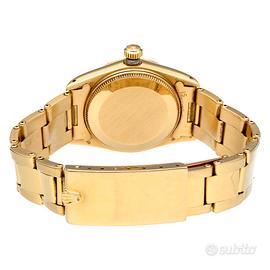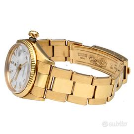 Questo esemplare, con cassa da 31 mm, monta un raffinato quadrante bianco con numeri romani, configurazione estremamente elegante e tipica dell’epoca. Il tutto è completato dal prezioso bracciale Oyster rivettato interamente in oro giallo.