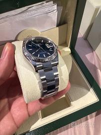 In vendita splendido Rolex Datejust 36 (Ref. 126234) nella configurazione più ricercata ed elegante: Quadrante Blu con finitura "Sunray", Lunetta Zigrinata in oro bianco e Bracciale Oyster in acciaio.