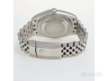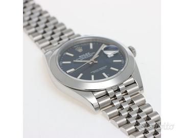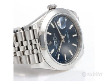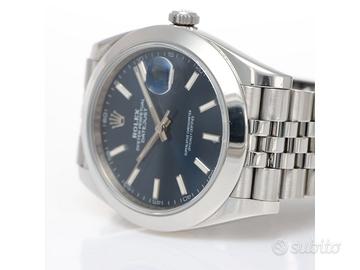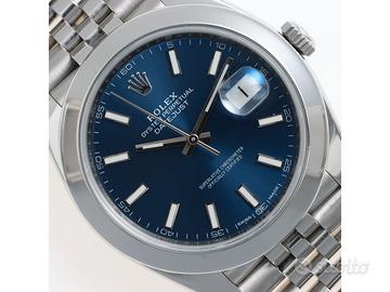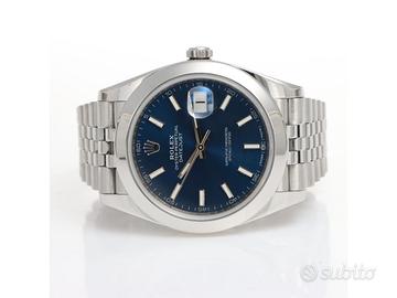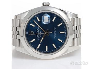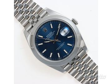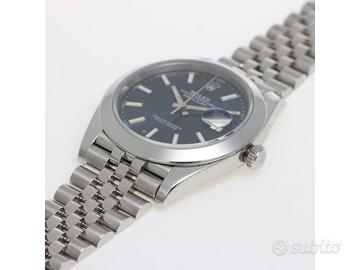 Clover Gioielli pone in vendita Rolex Datejust Ref. 126300 realizzato in acciaio, Quadrante Blu, Lunetta fissa in acciaio, Cassa di diametro 41 mm, Corona di carica a vite, Datario ad ore 3. Bracciale modello Jubilee. Orologio in condizioni ottime. Garanzia datata 03/2018. Full Set.