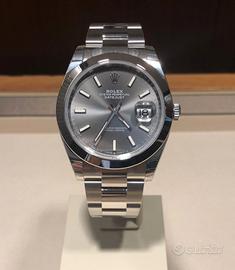 vendo Rolex datejust 41 mm quadrante rodium bracciale Oyster, ref 126300. Mai indossato, mai portato a misura (ha tutte le sue maglie montate), acquistato e messo in cassetta di sicurezza. L'orologio è visionabile solo all'interno della mia gioielleria di fiducia. Non incontro e non faccio trattative in altri posti con l'orologio. Ovviamente è completo di tutto il suo corredo (ha anche la contro scatola beige ed il copri ghiera). Contattate solo se seriamente interessati.