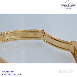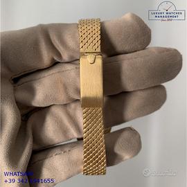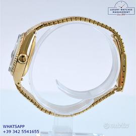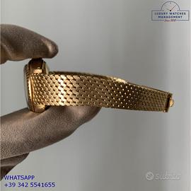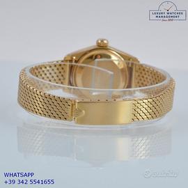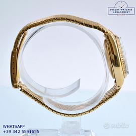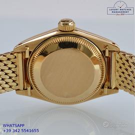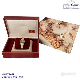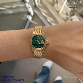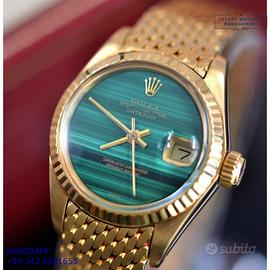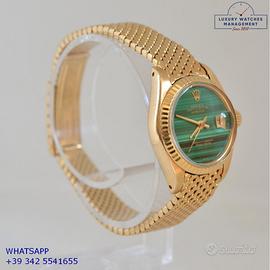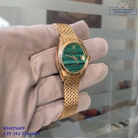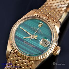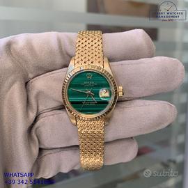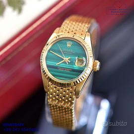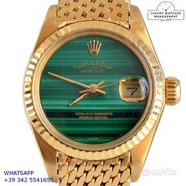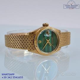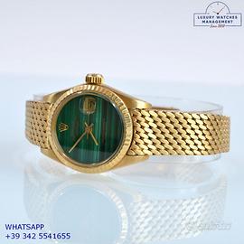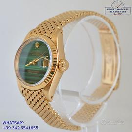 Rolex Datejust Ladies 26MM oro giallo 18KT, anno di produzione 1978, ghiera oro giallo 18KT zigrinata, vetro plastica con lente ciclope, quadrante in pietra malachite colore verde con data e sfere oro giallo, movimento meccanico a carica automatico, raro bracciale Milanese oro giallo 18KT con chiusura deployante originale Rolex.