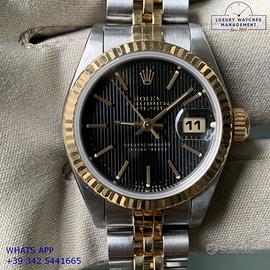 Per conoscere il prezzo e le caratteristiche tecniche dei nostri orologi visita il nostro sito ufficiale: https://lwmitalia.com/it Tutti i nostri orologi vengono verificati e revisionati dal nostro laboratorio specializzato “KeepTime Lab”: https://keeptimelab.com/it/ Rolex Datejust da donna da 26MM acciaio e oro giallo 18KT, anno di produzione 1996, ghiera zigrinata in oro giallo 18KT, vetro zaffiro antiriflesso con lente ciclope, quadrante Tapestry colore nero con data indici e sfere al trizio, movimento meccanico a carica automatica, bracciale Jubilee acciaio e oro giallo 18KT con chiusura deployante originale Rolex. Orologio originale Rolex in ogni sua parte, già revisionato in ottime condizioni, segni di usura assenti o appena visibili, full set (scatola, accessori vari, garanzia traforata ufficiale Rolex), garanzia/dichiarazione di vendita del nostro negozio valida per 12 mesi.