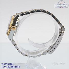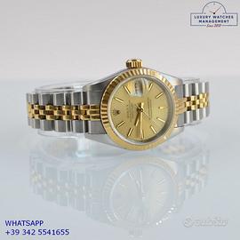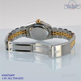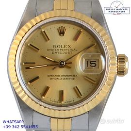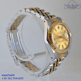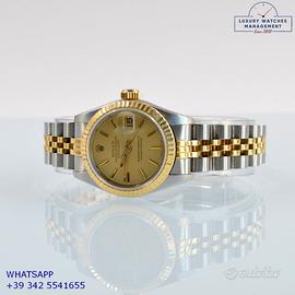 Rolex Datejust ladies 26MM acciaio e oro giallo 18KT, anno di produzione 1985, ghiera zigrinata in oro giallo 18KT, vetro zaffiro antiriflesso con lente ciclope, quadrante colore champagne con data indici e sfere al trizio, movimento meccanico a carica automatica, bracciale Jubilee acciaio e oro giallo 18KT con chiusura deployante originale Rolex.
