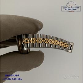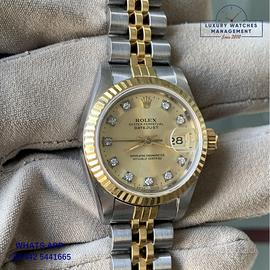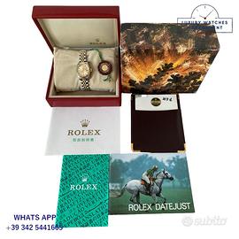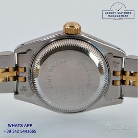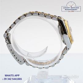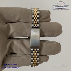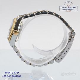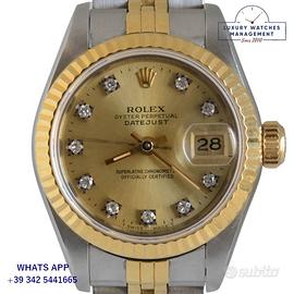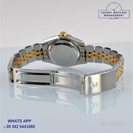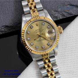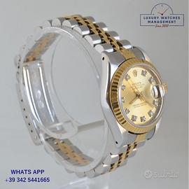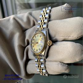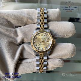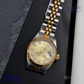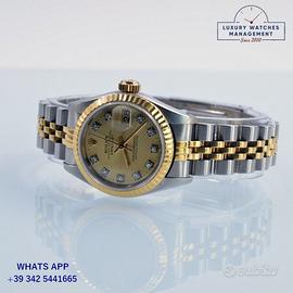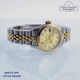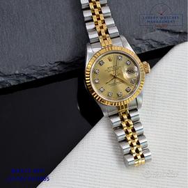Rolex Datejust ladies 26MM acciaio e oro giallo 18KT, anno di produzione 1985, ghiera zigrinata in oro giallo 18KT, vetro zaffiro antiriflesso con lente ciclope, quadrante colore champagne con data indici diamanti e sfere al trizio, movimento meccanico a carica automatica, bracciale Jubilee acciaio e oro giallo 18KT con chiusura deployante originale Rolex.