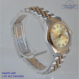 Rolex Datejust ladies 26MM acciaio e oro giallo 18KT, anno di produzione 1986, ghiera zigrinata in oro giallo 18KT, vetro zaffiro antiriflesso con lente ciclope, quadrante colore champagne con data indici diamanti e sfere al trizio, movimento meccanico a carica automatica, bracciale Jubilee acciaio e oro giallo 18KT con chiusura deployante originale Rolex.