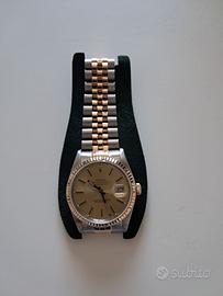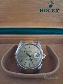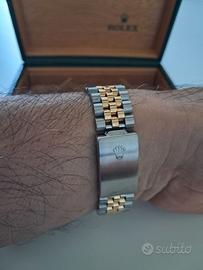 Rolex Datejust diametro 36mm Anno 1991 Referenza 16233 Carica Automatica Diametro 36 mm Materiale della cassa Oro giallo e acciaio Materiale del cinturino Oro giallo e acciaio Materiale vetro Zaffiro Corredo Prodotto venduto con scatola e garanzia originale Rolex Datejust Referenza 16233 realizzato in acciaio e oro giallo, Quadrante champagne, Lunetta fissa zigrinata in oro giallo, Cassa di diametro 36mm, Corona a vite, Datario ad ore 3, Bracciale modello jubilee in acciaio e oro giallo, N. 2 maglie cinturino acciaio oro, Astuccio da viaggio velluto verde, Rolex set composto da libretti e scatola. Orologio in condizioni eccellenti. Anno 1991 tenuto in ottime condizioni veramente senza segni d’usura. Orologio revisionato a gennaio 2026 con garanzia per due anni. Full Set. L'orologio è accompagnato da scatola e garanzia ufficiale Rolex oltre al certificato fotografico valido fino a gennaio 2028 rilasciato dal venditore dove ho acquistato il Rolex che ne garantisce il buon funzionamento, l'autenticità e la lecita provenienza. L’orologio è visionabile su appuntamento presso di me. TERMINI E CONDIZIONI. Il pagamento è a carico del cliente con bonifico istantaneo. Il venditore dichiara che il bene oggetto del presente annuncio è originale. Per approfondimenti, se siete interessati all'acquisto, fatemi avere la Vostra potenziale proposta d'acquisto e potrà essere successivamente visionato tutto venendo da me, cordiali saluti.