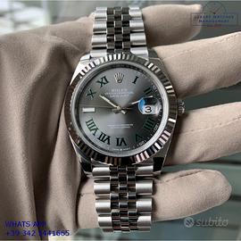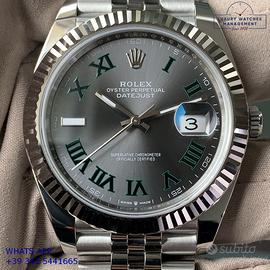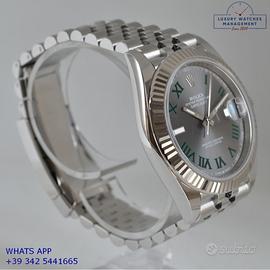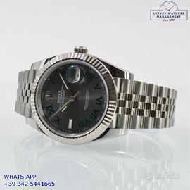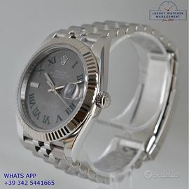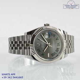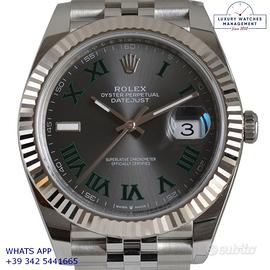 Rolex Datejust II 41MM acciaio e oro bianco 18KT, anno di produzione 2025, ghiera oro bianco 18KT zigrinata, vetro zaffiro antiriflesso con lente ciclope, quadrante Wimbledon colore grigio con data indici romani verdi originale Rolex, movimento meccanico a carica automatica, bracciale Jubilee acciaio con chiusura Oysterclasp originale Rolex.