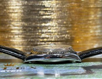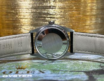 Orologio completamente originale in tutte le sue parti. Rolex Datejust Ref. 1601 del 1970 nero da 36mm automatico in pelle. Questo modello si distingue per una cassa Oyster da 36 mm, una dimensione perfetta e senza tempo, ideale sia per un utilizzo quotidiano che per occasioni più formali. La struttura è realizzata in acciaio con lunetta zigrinata in oro bianco, uno degli elementi estetici più iconici della maison Rolex, capace di riflettere la luce in modo unico e raffinato. Il quadrante, spesso di tipo "pie-pan" con inclinazione verso l'interno, dona profondità e carattere all'orologio, mentre la lente Cyclope sopra il datario garantisce una leggibilità immediata, firma distintiva della collezione Datejust. A completare il design troviamo il vetro plexiglass bombato, tipico degli orologi vintage, che conferisce calore e autenticità al segnatempo. All'interno batte il celebre calibro Rolex 1570, un movimento automatico di manifattura noto per la sua affidabilità, precisione e longevità. Questo calibro rappresenta uno dei pilastri della produzione Rolex vintage, con una frequenza di 19.800 alternanze/ora e una costruzione progettata per durare nel tempo. Il movimento garantisce una carica automatica efficiente e prestazioni solide, rendendo questo orologio non solo un oggetto da collezione, ma anche un compagno quotidiano perfettamente funzionale. La referenza 1601, in particolare, rappresenta una delle configurazioni più amate grazie alla sua versatilità: elegante con un abito, ma perfettamente a suo agio anche in un contesto più casual. L'orologio è venduto con garanzia di 12 mesi della nostra gioielleria, a conferma dell'affidabilità e della qualità del prodotto.