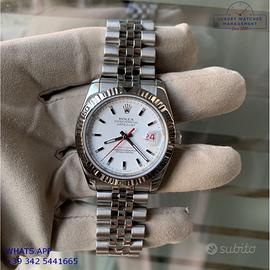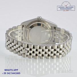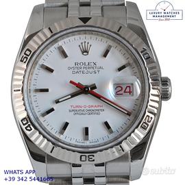 Rolex Datejust Turn-O-Graph acciaio, anno di produzione 2005, ghiera oro bianco 18KT zigrinata, vetro zaffiro antiriflesso con lente cyclope, quadrante colore bianco con datario roulette, indici e sfere al LumiNova, movimento meccanico a carica automatica, bracciale Jubilee acciaio con chiusura deployante a scomparsa originale Rolex.
