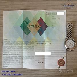 Orologio originale Rolex in ogni sua parte, revisionato in ottime condizioni, segni di usura assenti o appena visibili, full set (scatola, accessori vari, garanzia traforata ufficiale Rolex), garanzia/dichiarazione di vendita nostro negozio valida per 12 mesi.