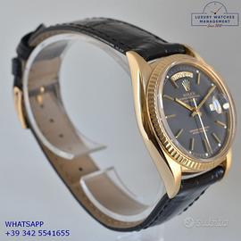 Rolex President 1803 Day-Date oro giallo 18KT, anno di produzione 1972, ghiera oro giallo 18KT zigrinata, vetro plastica con lente cyclope, quadrante colore nero opaco con datario in lingua italiana indici e sfere al trizio, originale Rolex dell'epoca mai ritoccato o ristampato, movimento meccanico a carica automatica, cinturino in pelle di alligatore lucido colore nero con fibbia dorata originale Rolex.
