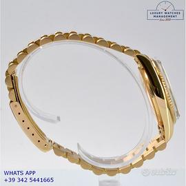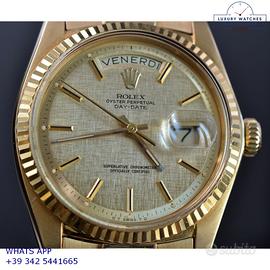 Rolex President 1803 Day-Date oro giallo 18KT, anno di produzione 1973, ghiera oro giallo 18KT zigrinata, vetro plastica con lente cyclope, quadrante linen colore champagne con datario in lingua Italiana, originale Rolex dell'epoca mai ritoccato o ristampato, movimento meccanico a carica automatica, bracciale President oro giallo 18KT con chiusura deployante originale Rolex.