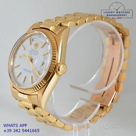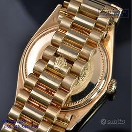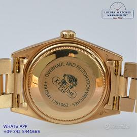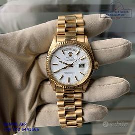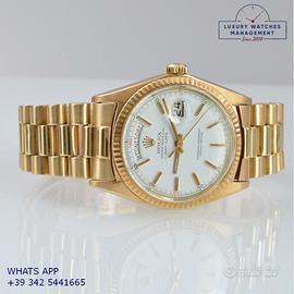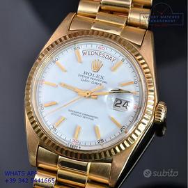 Rolex President 1803 Day-Date oro giallo 18KT, anno di produzione 1972, ghiera oro giallo 18KT zigrinata, vetro plastica con lente cyclope, raro quadrante colore bianco con grafica dei quarti di colore rosso e datario in lingua inglese, originale Rolex dell'epoca mai ritoccato o ristampato, movimento meccanico a carica automatica, bracciale President oro giallo 18KT con chiusura deployante, più altro cinturino in alligatore colore marrone con fibbia dorata Rolex.