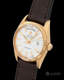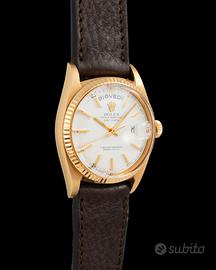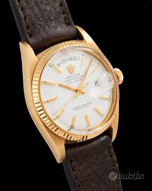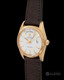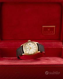 Rolex Day-Date 36 Very Rare Red Quarter Dial - 18 Kt BrandRolex ModelloDay Date 36 Referenza1803 Diametro cassa (mm)36 Colore quadranteBianco Cristallo/vetroPlexiglas MovimentoAutomatico Cinturino/braccialePelle Marrone CondizioniOttimo Anno1970 Rolex Day-Date 36 Ref. 1803. Very Rare Red Quarter Dial - 18 Kt. N/S 240XXXX. 36 mm. Scatola originale Rolex. Anno 1970. Esemplare fuori dal comune. Non il solito Day-Date. Questo Rolex Day-Date Ref. 1803 in oro giallo 18 kt monta uno dei quadranti più difficili da trovare sul mercato: il “Red Quarter Dial”, dettaglio distintivo e altamente collezionabile che lo rende immediatamente riconoscibile e ricercato. Quadrante con scritte e minuteria con accenti rossi, configurazione rara e sempre più introvabile. Giorni della settimana in italiano, ulteriore plus per collezionisti. Cassa da 36 mm con lunetta zigrinata iconica, in condizioni molto buone. Movimento automatico Rolex, preciso e affidabile. Montato su cinturino in pelle marrone di alta qualità (aftermarket), pronto da indossare. Un pezzo che non capita spesso, Perfetto per chi vuole distinguersi o aggiungere un Day-Date davvero speciale alla propria collezione. WHATSAPP: SITO WEB: www.rx23.it INSTAGRAM: rxvintagewatches