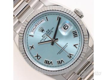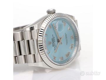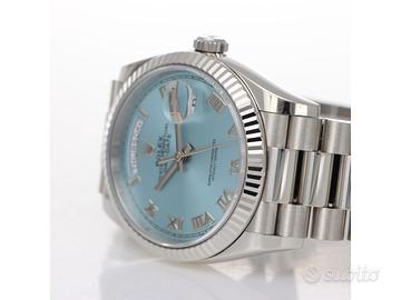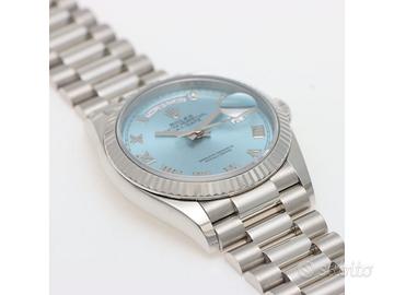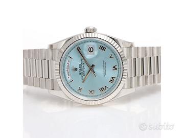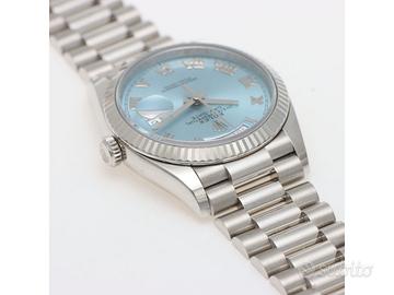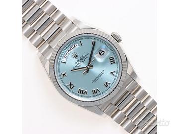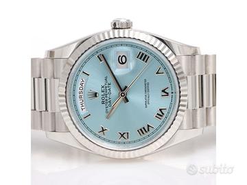 Clover Gioielli pone in vendita Rolex Day-Date Ref. 128236 con quadrante blu ghiaccio e numeri romani, cassa di diametro 36 mm in platino, corona di carica a vite, datario ad ore 3, indicazione del giorno ad ore 12, ghiera zigrinata in platino, bracciale President in platino. Orologio in condizioni eccellenti. Garanzia datata 2024. Full Set.