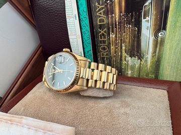 Vendo bellissimo Rolex Day date president,ref 18238,in ottime condizioni,anni 90,full set,doppio quadrante,nero e blu,unico proprietario,acquistato in italia con ancora scontrino di acquisto,full full set,cedo a 18000 euro no trattabile