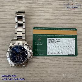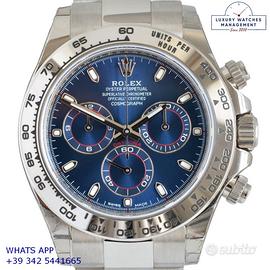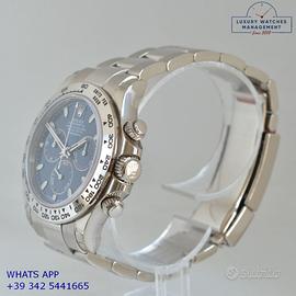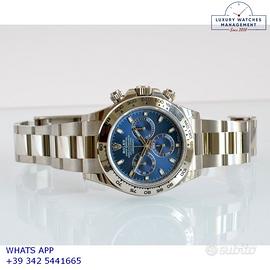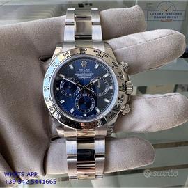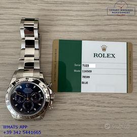 Per conoscere il prezzo e le caratteristiche tecniche dei nostri orologi visita il nostro sito ufficiale: https://lwmitalia.com/it Tutti i nostri orologi vengono verificati e revisionati dal nostro laboratorio specializzato “KeepTime Lab”: https://keeptimelab.com/it/ Rolex Daytona 116509 oro bianco 18KT, anno di produzione 2021, ghiera oro bianco 18KT a scala graduata 400, vetro zaffiro antiriflesso, quadrante colore blu a tre contatori orizzontali con indici e sfere al chromalight, movimento meccanico a carica automatica, bracciale Oyster oro bianco 18KT con chiusura deployante originale Rolex. Orologio originale Rolex in ogni sua parte, in ottime condizioni come nuovo, segni di usura assenti o appena visibili, full set (scatola, accessori vari, garanzia card originale Rolex valida 5 anni), garanzia/dichiarazione di vendita nostro negozio valida per 12 mesi.
