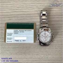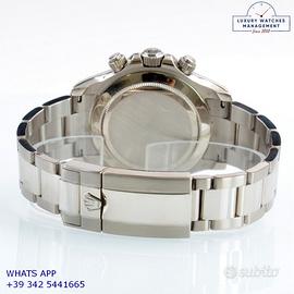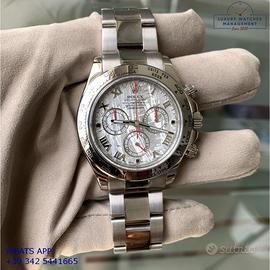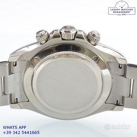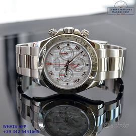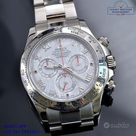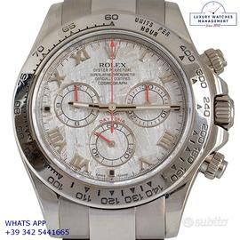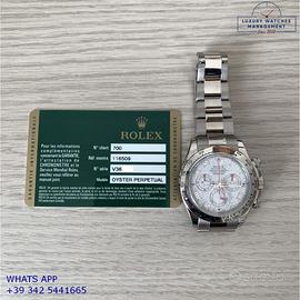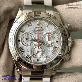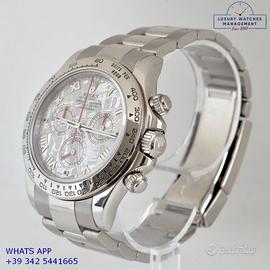 Rolex Daytona 116509 oro bianco 18KT, anno di produzione 2010, ghiera oro bianco 18KT a scala graduata 400, vetro zaffiro antiriflesso, quadrante Meteorite a tre contatori orizzontali indici romani e sfere al chromalight, movimento meccanico a carica automatica, bracciale Oyster oro bianco 18KT con chiusura deployante originale Rolex.