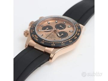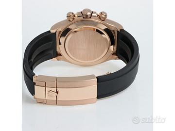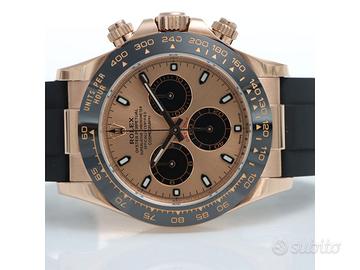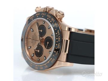 Clover Gioielli pone in vendita Rolex Daytona Ref. 116515LN realizzato in oro rosa 18 kt, quadrante sundust, lunetta in ceramica nera con scala tachimetrica 400, cassa di diametro 40 mm , corona di carica e pulsanti del chrono a vite, cinturino modello oysterflex nero. Orologio in condizioni eccellenti. Anno 2020. Card nuova. Full set.