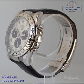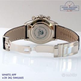 Rolex Daytona 116519 oro bianco 18KT, anno di produzione 2009, ghiera oro bianco 18KT a scala graduata 400, vetro zaffiro antiriflesso, quadrante Racing Panda con indici arabi indici e sfere al Luminova originale Rolex, movimento meccanico a carica automatica, cinturino alligatore colore nero con chiusura deployante oro bianco 18KT originale Rolex.