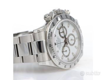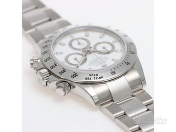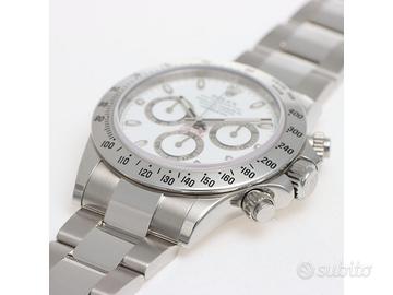 Clover Gioielli pone in vendita Rolex Daytona Ref. 116520 realizzato in acciaio, quadrante bianco chromalight "APH", cassa di diametro 40 mm, corona di carica a vite e pulsanti in acciaio, lunetta in acciaio con scala tachimetrica 400. Bracciale Oyster in acciaio. Orologio in condizioni eccellenti revisionato a Gennaio 2026. Full Set. Garanzia bicolore datata 11/2014.