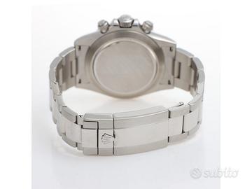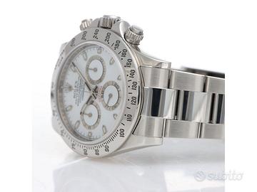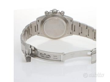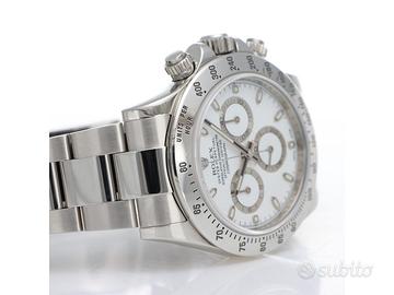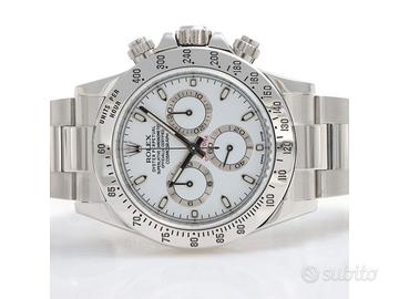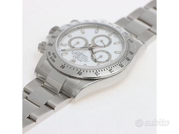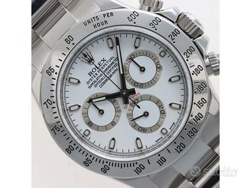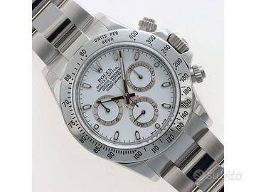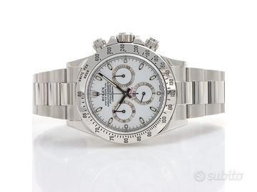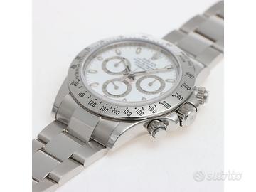 Clover Gioielli pone in vendita Rolex Daytona Ref. 116520 realizzato in acciaio, quadrante bianco Chromalight "APH", cassa di diametro 40 mm, corona di carica a vite e pulsanti in acciaio, lunetta in acciaio con scala tachimetrica 400. Bracciale Oyster in acciaio. Orologio in condizioni eccellenti. Full Set. Garanzia datata 2014. L'orologio è accompagnato da scatola e garanzia ufficiale Rolex oltre al nostro certificato fotografico valido 12 mesi che ne garantisce il buon funzionamento, l'autenticità e la lecita provenienza. Gli orologi sono tutti visionabili su appuntamento presso la nostra Boutique. TERMINI E CONDIZIONI Si ricorda che sono esclusi dalla nostra garanzia della durata di 12 mesi il deterioramento dovuto a usura e danni causati da un uso improprio e/o da trattamento inadeguato, perdita e furto oltre a interventi effettuati da terzi non autorizzati. Il pagamento di eventuali dazi è a carico del cliente.