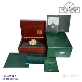 Orologio Rolex originale in ogni sua parte, revisionato in ottime condizioni, segni di usura assenti o appena visibili, full set (scatola, accessori vari, garanzia ufficiale punzonata del concessionario Rolex di Dubai), garanzia/dichiarazione di vendita nostro negozio valida per 12 mesi.