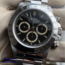 Rolex Daytona 16520 acciaio vera seria Patrizzi, anno di produzione 1998, ghiera acciaio scala graduata 400, vetro zaffiro, quadrante Patrizzi colore nero con contatori virati al colore nocciola, indici e sfere al trizio, movimento meccanico a carica automatica, bracciale Oyster acciaio con chiusura deployante Rolex.