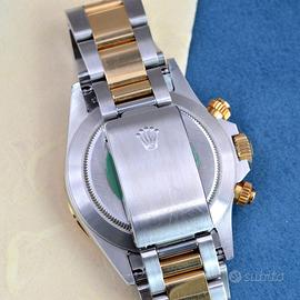 Rolex Daytona 16523 acciaio e oro giallo 18KT, anno di produzione 1990, ghiera MK1 in oro giallo 18KT scala graduata 200, vetro zaffiro, quadrante colore champagne a 4 scritte con sei rovesciato originale coevo Rolex dell'epoca, movimento meccanico a carica automatica, bracciale Oyster acciaio e oro giallo 18KT con chiusura deployante originale Rolex.