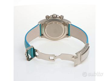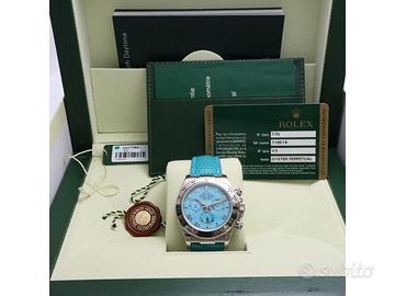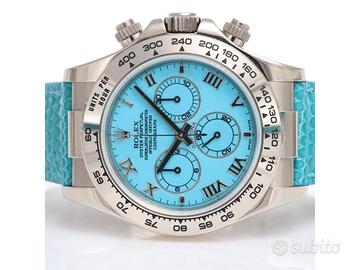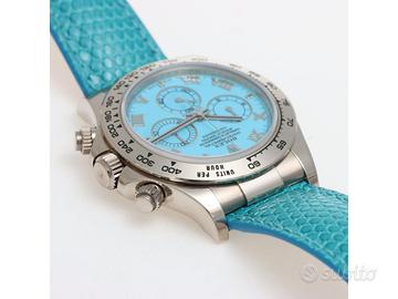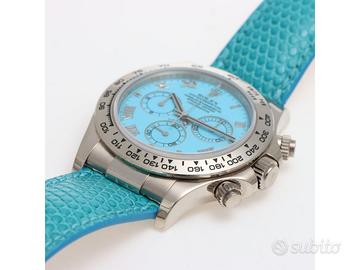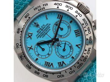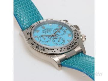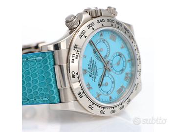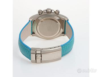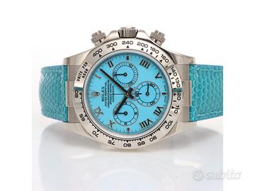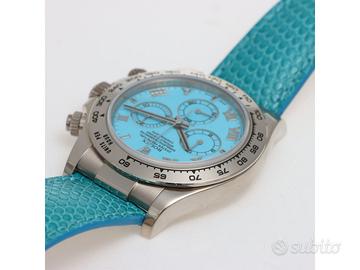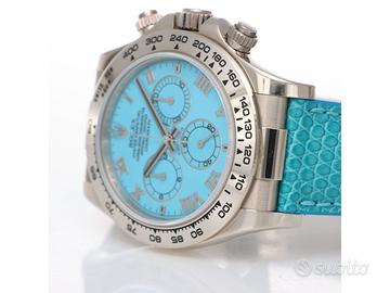 Clover Gioielli pone in vendita Rolex Daytona Beach Ref. 116519 realizzato in oro bianco, quadrante turchese, con numeri romani, cassa di diametro 40 mm, corona di carica a vite e pulsanti del crono a vite, lunetta in oro bianco con scala tachimetrica 400. Bracciale in pelle di colore blu con chiusura deployantè in oro bianco. Orologio in condizioni eccellenti mai lucidato. Unicon proprietario. Full Set. Garanzia Italiana datata 08/2009.