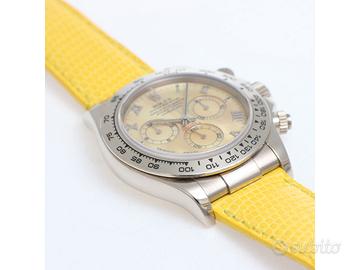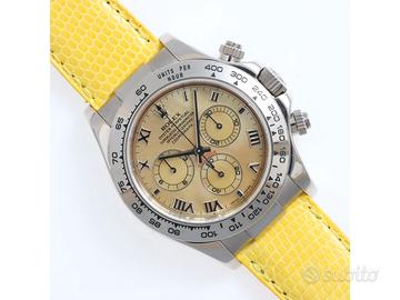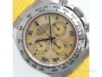 Clover Gioielli pone in vendita Rolex Daytona "Beach" Ref. 116519 realizzato in oro bianco, quadrante in madreperla Gialla con numeri romani, cassa di diametro 40 mm, corona di carica a vite e pulsanti del crono a vite, lunetta in oro bianco con scala tachimetrica 400. Bracciale in pelle di colore giallo con chiusura deployantè in oro bianco. Orologio in condizioni ottime. Unico proprietario. Full Set. Garanzia Italiana datata 2002, Seriale K12XXXX. L'orologio è accompagnato da scatola e garanzia ufficiale Rolex oltre al nostro certificato fotografico valido 12 mesi che ne garantisce il buon funzionamento, l'autenticità e la lecita provenienza. Gli orologi sono tutti visionabili su appuntamento presso la nostra Boutique. TERMINI E CONDIZIONI Si ricorda che sono esclusi dalla nostra garanzia della durata di 12 mesi il deterioramento dovuto a usura e danni causati da un uso improprio e/o da trattamento inadeguato, perdita e furto oltre a interventi effettuati da terzi non autorizzati. Il pagamento di eventuali dazi è a carico del cliente.