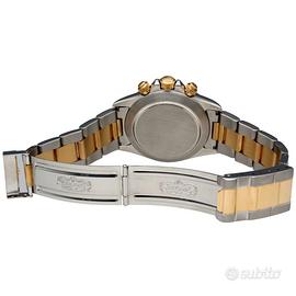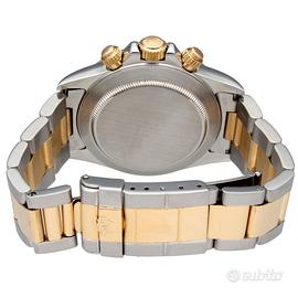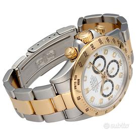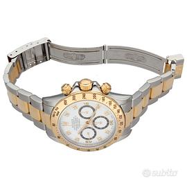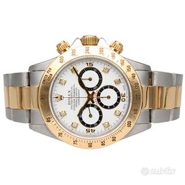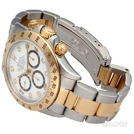 Rolex Daytona Zenith ref. 16523, anno 1992, acciaio e oro, quadrante bianco indici diamanti, automatico, inverted 6, full set Iconico Rolex Daytona Zenith ref. 16523, proposto in una configurazione estremamente affascinante con quadrante bianco impreziosito da indici diamanti e dettaglio molto ricercato del 6 invertito. Esemplare dei primi anni ‘90 con movimento Zenith, tra i più apprezzati dai collezionisti per la sua importanza storica e tecnica. Orologio completo di garanzia italiana, configurazione full set, elemento sempre più raro da reperire su questa referenza. Dati tecnici: Marca: Rolex Modello: Daytona Referenza: 16523 Anno: 1992 Seriale: N2XXXXX Movimento: automatico (calibro Zenith) Materiale cassa: acciaio e oro Diametro cassa: 40 mm Quadrante: bianco con indici diamanti Vetro: zaffiro Ghiera: oro con scala tachimetrica Bracciale: Oyster acciaio e oro Chiusura: deployante Rolex Funzioni: Ore, minuti, secondi Cronografo Scala tachimetrica Corredo: Scatola originale Rolex Garanzia originale italiana Nostra garanzia 24 mesi L'orologio è originale e di lecita provenienza. Per visionare l'orologio di persona è necessario prendere un’ appuntamento in negozio. L'orologio viene venduto comprensivo di garanzia del nostro negozio, valida 24 mesi e garantisce il buon funzionamento, l’originalità e la lecita provenienza. Le foto pubblicate sono realmente dell’orologio in vendita. Permutiamo e acquistiamo il vostro orologio usato delle migliori maison svizzere. Spediamo solo in Europa, con corriere assicurato di nostra fiducia.