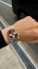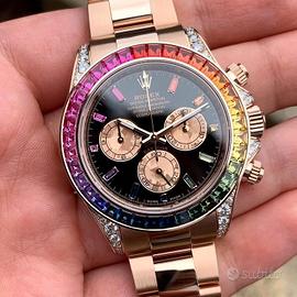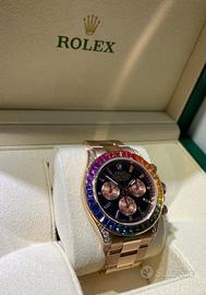 GIOIELLERIA VENEZIA PROPONE: Marca: Rolex. Modello: Rolex Daytona Rainbow. Numero di referenza:116595RBOW. CaricaAutomatico Materiale della cassa: Oro rosa. Materiale cinturino:Oro rosa. Anno di produzione: 2023. Condizione:Nuovo L'articolo è nuovo e non presenta segni di usura di nessun tipo. Garanzia: inizia dal momento dell' acquisto. Corredo: Con scatola originale e documenti originali. Calibro: CaricaAutomatico Calibro/Meccanismo4130. Riserva di carica: 72 h. Cassa: Materiale della cassaOro rosa Diametro40 mm Impermeabile10 ATM. Materiale lunetta: Oro rosa VetroVetro zaffiro QuadranteNero Numeri sul quadranteSenza numeri. Cinturino: Materiale cinturinoOro rosa Colore cinturinoRosa fucsia. Chiusura: Déployante Materiale chiusuraOro rosa.