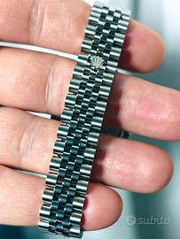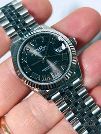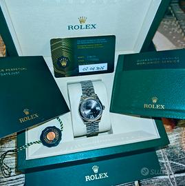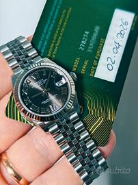 In vendita splendido Rolex Datejust 31 Lady donna (Ref. 278274), una perfetta sintesi di eleganza senza tempo e lusso contemporaneo. Questo modello, nella raffinata misura da 31mm, è caratterizzato da una configurazione ricercata e di grande classe. Dettagli dell’orologio: Referenza: 278274 Quadrante: Antracite / marrone /grigio con finitura soleil, impreziosito da un tocco di luce esclusivo: il numero 6 con castone in oro e diamanti. Lunetta: Zigrinata in oro bianco 18 ct, icona di stile Rolex. Bracciale: super Jubilee a cinque file, celebre per il suo comfort e la sua estetica raffinata con chiusura nascosta. Materiale: Rolesor Bianco (acciaio Oystersteel e oro bianco). Condizioni: Nuovo, mai indossato, completamente pellicolato Rolex, tutte le pellicole presenti. Anno: Aprile 2026. Corredo: L’orologio è un Full Set completo di tutto il corredo originale: Scatola e controscatola Rolex. Garanzia Internazionale Rolex (valida fino al 2031). Libretti d'istruzione e manuale di garanzia. Sigillo verde (Superlative Chronometer). Un pezzo incantevole, ideale per un regalo indimenticabile o per arricchire la propria collezione con un modello dalla rivendibilità garantita e dal fascino magnetico. Garantisco con contratto di vendita l'originalità e la lecita provenienza di questo segnatempo. NO TRUFFE E NO PERDITEMPO. Incontro solo in gioielleria su appuntamento e previo invio documenti. NON TRATTABILE PERCHÈ I PREZZI SONO AI MINIMI DI MERCATO. Per le permute solo full set.