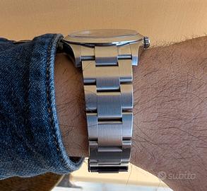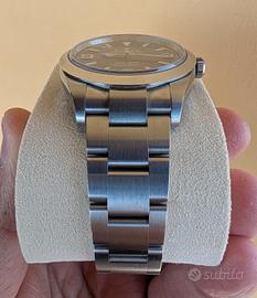 ROLEX Explorer 1 referenza 214270. Acquistato personalmente nel 2018 in concessionario ufficiale rolex nella misura 39 mm, ottimo compromesso tra il 36 e il 40 mm attuale. Orologio usato in poche occasioni e tenuto in cassetta, come si vede dalle foto ha solo un graffio più evidente sulla chiusura che si può rimuovere senza problemi da qualunque orologiaio. Ha tutto il corredo con documenti, scontrino, sigillo, scatola e controscatola pari al nuovo. Effettuo consegna a mano nella mia gioielleria di fiducia, solo pagamento con bonifico istantaneo. Non scambio e non rispondo ad offerte assurde.