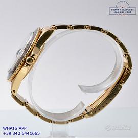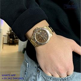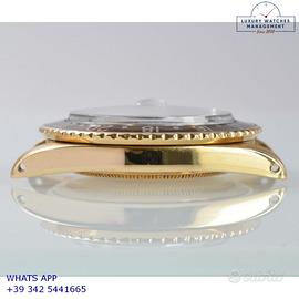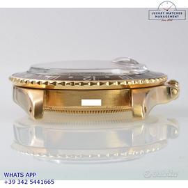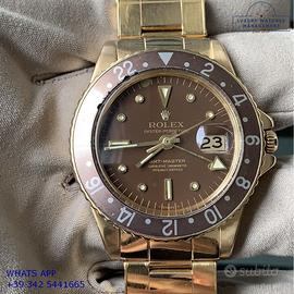 Rolex GMT Master 1675 Concorde oro giallo 18KT, anno di produzione 1968, ghiera oro giallo 18KT bidirezionale inserto alluminio colore marrone virato, vetro plastica lente ciclope, quadrante in smalto color marrone cioccolato con data indici occhio di tigre e sfere al trizio, mai ritoccato o ristampato, movimento meccanico a carica automatica, bracciale Oyster oro giallo 18KT a maglie ripiegate con rivetti chiusura deployante Rolex.