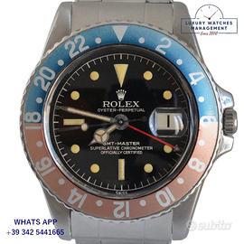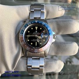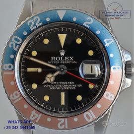 Rolex GMT Master 1675 cassa Cornino acciaio, anno di produzione 1962, ghiera bidirezionale acciaio con inserto alluminio Pepsi prima seria “Fat Font no serif” originale dell’epoca, vetro plastica con lente ciclope, raro quadrante colore nero lucido a grafica argento con minuteria chiusa, indici e sfere al trizio con freccino piccolo GMT, movimento meccanico a carica automatica, bracciale Oyster acciaio a maglie ripiegate con rivetti chiusura deployante Rolex.