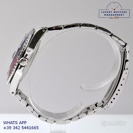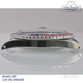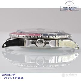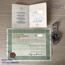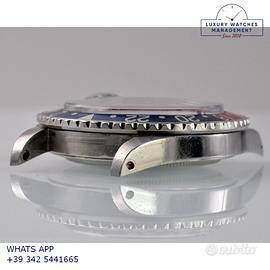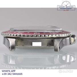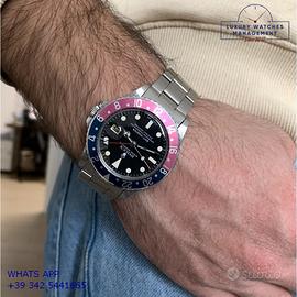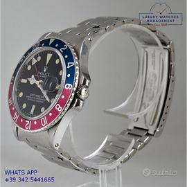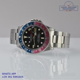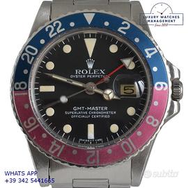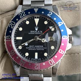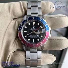 Rolex GMT Master 1675 acciaio, anno di produzione 1970, ghiera bidirezionale in acciaio con inserto Pepsi sfumato al rosa fucsia originale Rolex dell'epoca, vetro plastica con lente ciclope, quadrante colore nero opaco con data indici pallettoni e sfere al trizio, movimento meccanico a carica automatica, bracciale Oyster acciaio a maglie ripiegate con chiusura deployante originale Rolex dell’epoca.