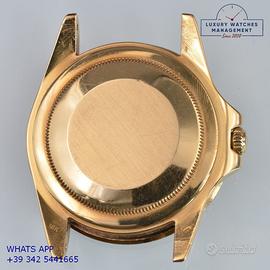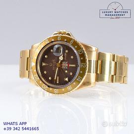 Rolex GMT Master 1675 oro giallo 18KT, anno di produzione 1972, ghiera oro giallo 18KT bidirezionale con inserto alluminio colore marrone virato, vetro plastica con lente ciclope, quadrante personalizzato UAE Quraysh Hawk by Mohammed bin Rashid Al Maktoum original Rolex/UAE of the epoch, movimento meccanico a carica automatica, bracciale Oyster 7206/8 in oro giallo 18K con chiusura deployante Rolex originale Rolex d'epoca, più altro cinturino vintage in pelle di vitello colore marrone con fibbia in oro giallo 18KT originale Rolex.
