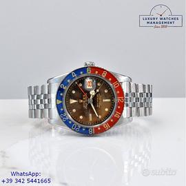 Rolex GMT Master 6542 prima serie senza spallette di protezione in acciaio, anno di produzione 1957, ghiera bidirezionale in ottone nichelato con inserto in bachelite Pepsi blu e rosso con ancora il radio luminescente originale Rolex dell'epoca, vetro plastica bombato lente cyclope, straordinario quadrante OCC color marrone lucido grafica dorata con indici e lancette ancora al radio luminescente originali dell'epoca, datario roulette rosso e nero, movimento automatico con rotore a farfalla, bracciale Jubilee in acciaio a maglie ripiegate con prima deployante Rolex della stessa epoca.
