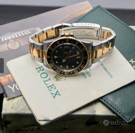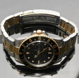 Rolex modello Gmt Master vintage acciaio e oro,referenza 16753,seriale R,anno di produzione 1987. Completamente coevo con quadrante nero Swiss T-25,cinturino Oyster acciaio e oro referenza 78363 con finali 480 e codice clasp L6(1987). Ottime condizioni e corredo completo con scatola,controscatola,garanzia Rolex paper,portagaranzia e libricino.