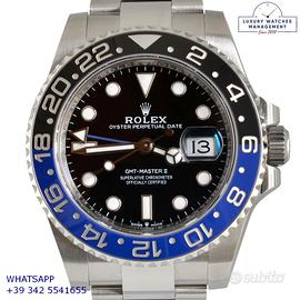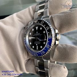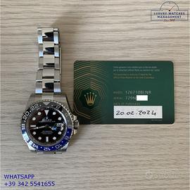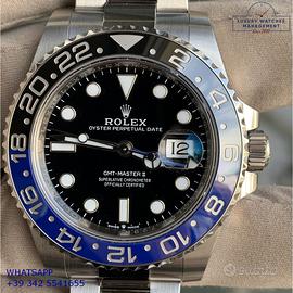 Rolex GMT Master II Batman Cerachrom acciaio, anno di produzione 2024, ghiera acciaio bidirezionale con inserto Cerachrom Batman colore blu e nero, vetro zaffiro antiriflesso con lente ciclope, quadrante colore nero con data indici e sfere al Chromalight, movimento meccanico a carica automatica, bracciale Oystersteel acciaio con chiusura deployante originale Rolex.