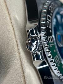 È l’incontro tra precisione e libertà. Il GMT-Master II 126720VTNR cattura lo sguardo con la sua cassa in acciaio lucido che riflette la luce come una finestra sul mondo. La lunetta Cerachrom verde e nera — fresca, vibrante, ribelle — evoca i continenti e le rotte che attraversano i cieli. La lancetta GMT verde scivola sul quadrante nero profondo come un aereo in volo notturno, segnalando un secondo fuso orario a chi vive oltre i confini.