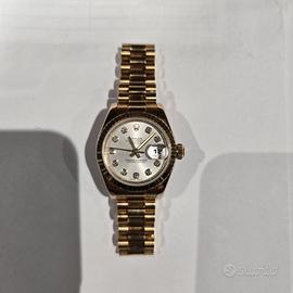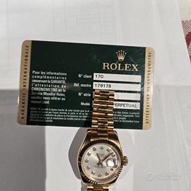 Vendo bellissimo orologio da donna Rolex referenza 179178 con documenti originali, senza scatola, 26 mm 10 atm , oro giallo, vetro zaffiro, diamanti sul quadrante, come si vede in foto. Cassa e bracciale President in Oro Giallo 18K Quadrante bianco ed indici in diamanti “Factory” Mai lucidato l'orologio è per un polso massimo 16 cm, purtroppo è stata smarrita la scatola con le maglie aggiuntive, (il prezzo ne tiene ampiamento conto, prezzo più basso che potete trovare) la garanzie e libricini ci sono, il prezzo non è trattabile, l'orologio così com'è pesa più di 100 g, come si vede in foto. scambio a mano in banca o da orologiaio di vostra fiducia "per la mia e la vostra sicurezza" . accetto solo bonifico istantaneo. L'orologio è del 2008 ma indossato pochissime volte (una decina in totale) nessun di divetto o graffio da segnalare. no perditempo, solo interessati, grazie