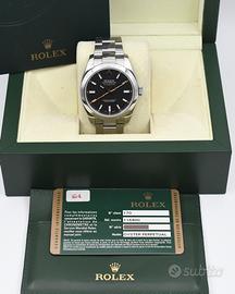 Modello iconico della linea Rolex Milgauss, cassa 40 mm in acciaio Oystersteel, movimento automatico, vetro zaffiro, impermeabile 100 metri. Celebre per la lancetta dei secondi a saetta e per la resistenza ai campi magnetici fino a 1.000 gauss.