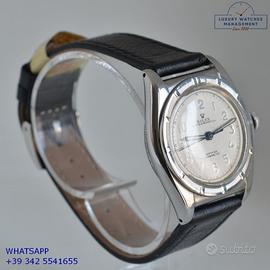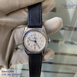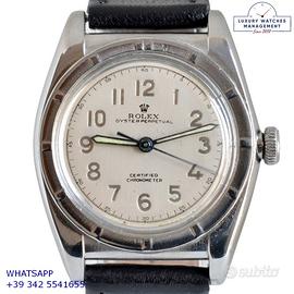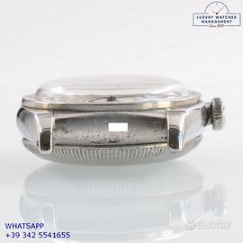 Rolex Ovetto Oyster Perpetual 2940 Chronometer Bubble Back acciaio, anno di produzione 1946, ghiera Thunderbird acciaio fissa, vetro plastica bombato, quadrante colore avorio con indici arabi e sfere al trizio originale Rolex dell’epoca mai ritoccato o ristampato, movimento meccanico a carca automatica, cinturino vintage in pelle di vitello colore nero con fibbia acciaio Rolex.