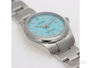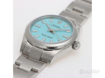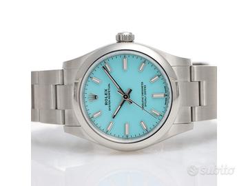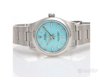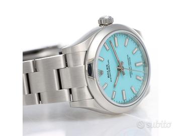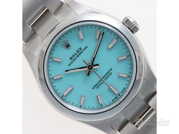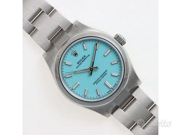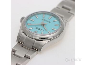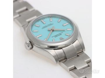 Clover Gioielli pone in vendita Rolex Oyster Perpetual Ref. 277200 realizzato in acciaio, Quadrante Tiffany, Lunetta liscia in acciaio, Cassa di diametro 31 mm, Corona di carica a vite, Bracciale modello oyster in acciaio. Orologio Nuovo. Garanzia datata 12/2025. Full Set.