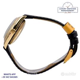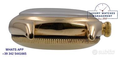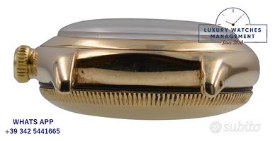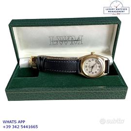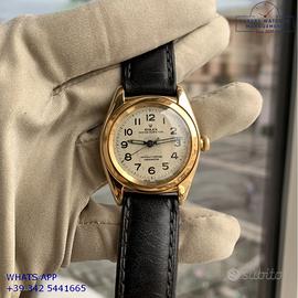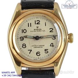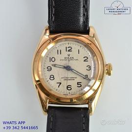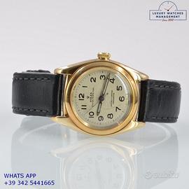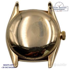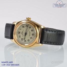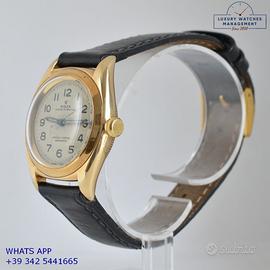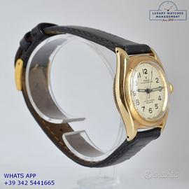 Rolex Ovetto BubbleBack oro giallo 14KT, anno di produzione 1948, ghiera oro giallo 14KT liscia, vetro plastica a cupola, quadrante colore avorio con indici arabi e sfere al radio originale Rolex dell’epoca mai ritoccato o ristampato, movimento meccanico a carica automatica, cinturino in pelle di vitello lucido colore nero con fibbia dorata Rolex.